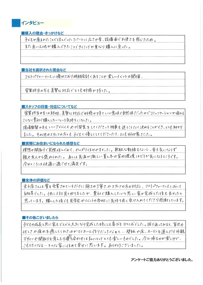 お引き渡し後に弊社に届いたお客様アンケートの回答です。