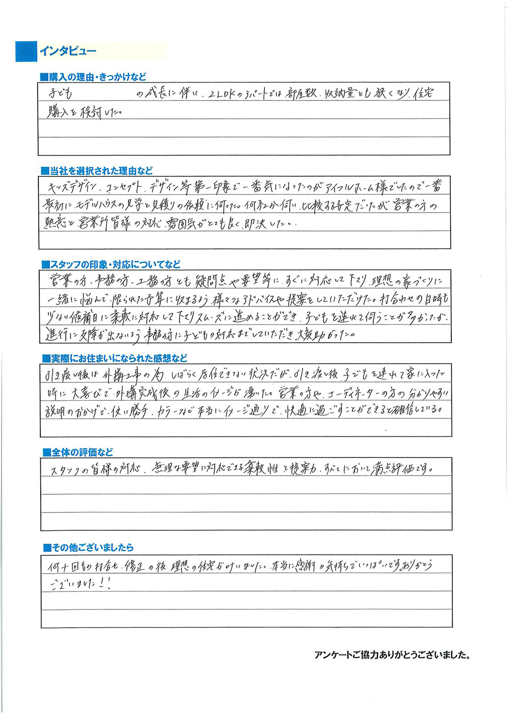 お引き渡し後に弊社に届いたお客様アンケートの回答です。