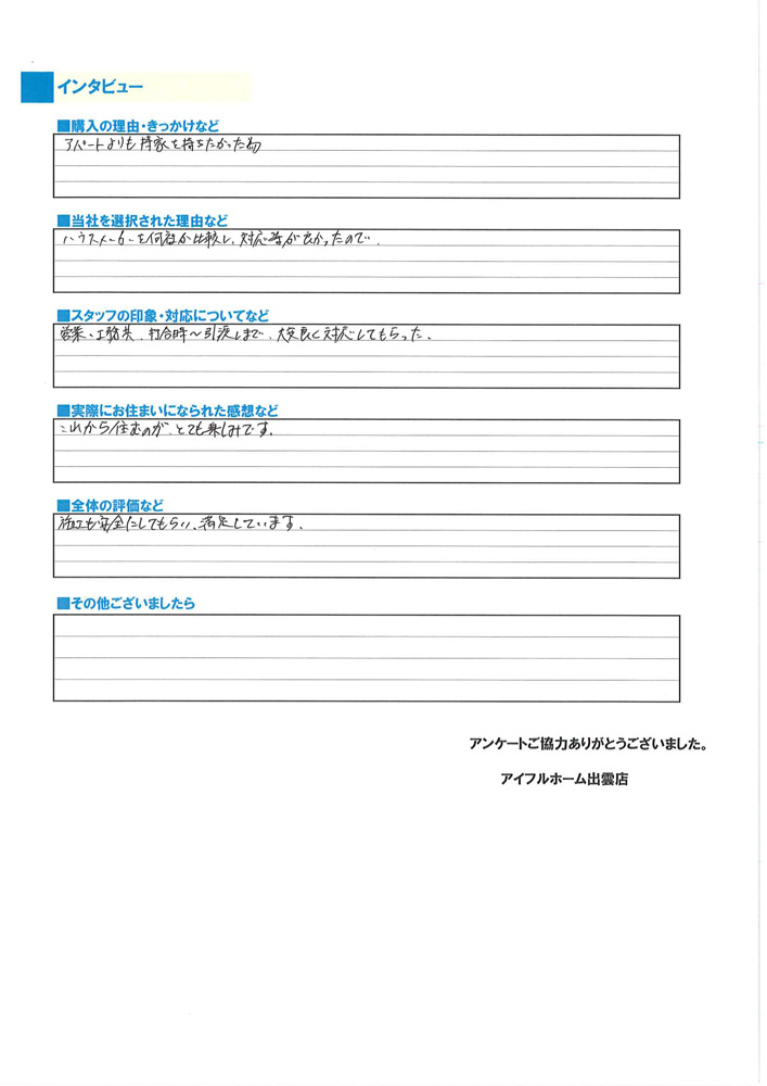 お引き渡し後に弊社に届いたお客様アンケートの回答です。 掲載に快く許可をいただきありがとうございました。