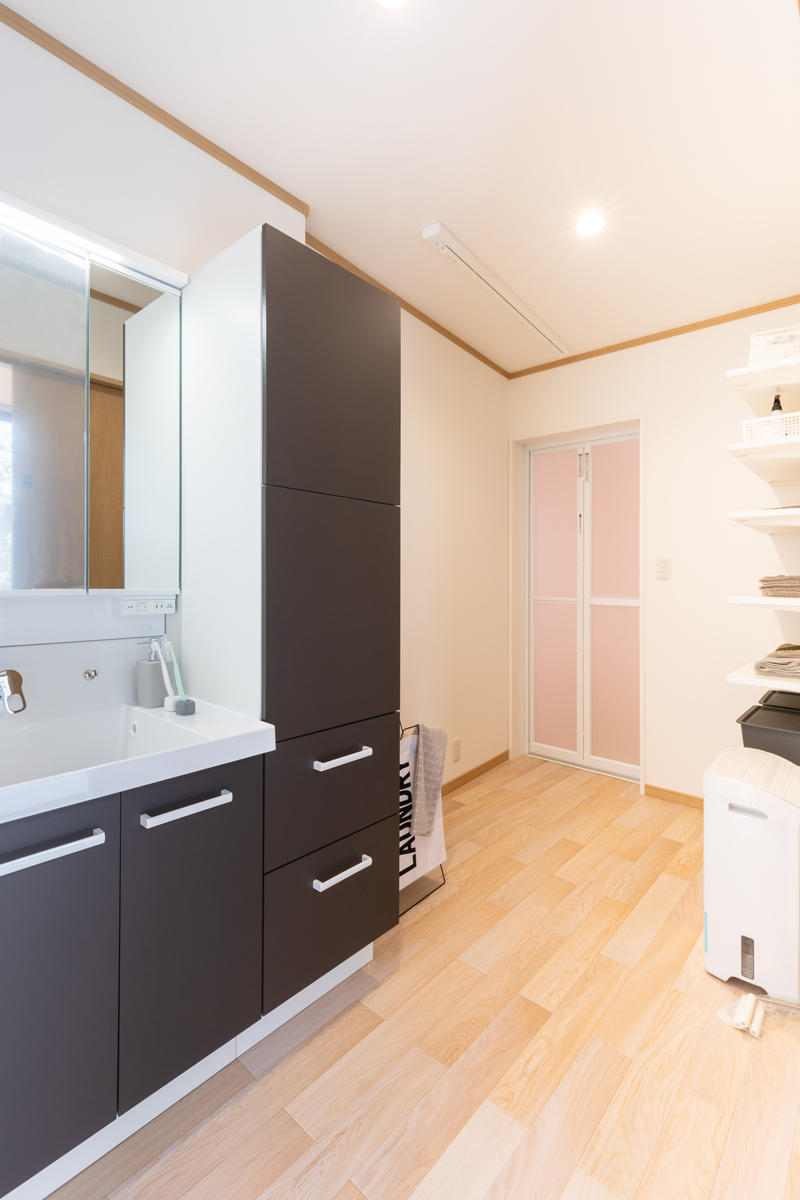 大家族で洗濯物が毎日たくさんあっても家事がしやすいように、洗濯物干しスペースを工夫。洗面所は広めにとり、雨の時は除湿器を利用して干せるようにしました。