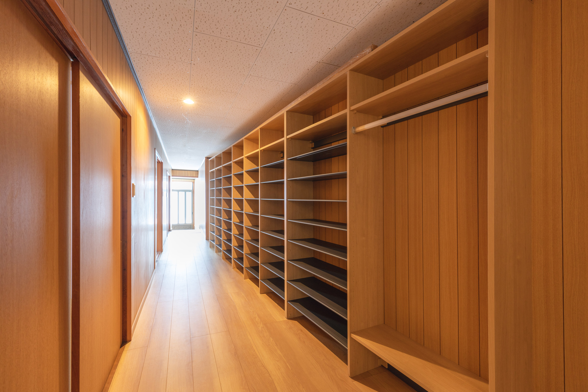 祖父母、曾祖母の各居室に直接行けるよう、段差をなくしてバリアフリーに。広い廊下スペースを生かして大容量収納棚を設置。靴や、コート、鞄など毎日家族が使うものをすぐに取り出せるスペースになりました。
