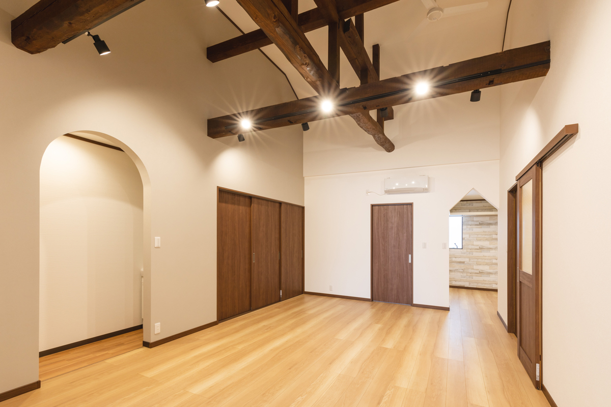 屋根裏スペースを生かして、梁見せ大空間に。シーリングファンを2機設置し、冷暖の効率に配慮。洗面台・冷蔵庫スペースを設けて、二世帯でのお互いのプライベート空間も大切にしました。