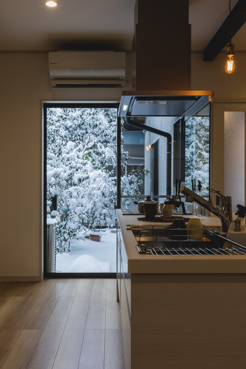 アイランドキッチンから、庭がみえる風景。冬の寒い日もあたたかく、風情のある空間になりました。