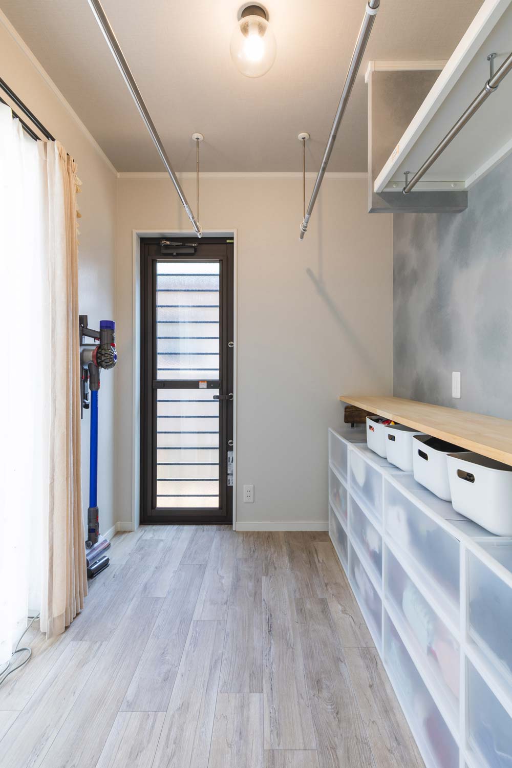 共働きのご夫婦の家事負担が少しでも軽減するよう、「干して・除湿器で乾かす・その場でしまう・アイロンがけしたものはそのまま吊るせる」を実現しました。