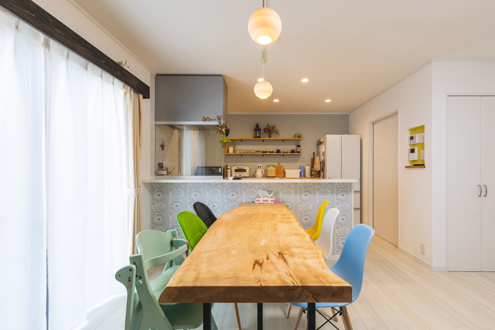 天然木の存在感のあるテーブルに北欧系のクロスをあしらったキッチンです。今回のリフォームに合わせて、リモコン用ニッチや、キッチンの腰壁クロスを変えました。内装はお洒落なご夫婦に合わせて、照明配置やニッチ・窓・収納の細部にわたってショップのような空間になりました。