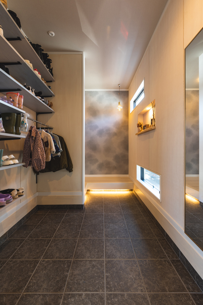 玄関ではお子さんが3人並んで靴を脱ぎ履きしやすいようL型の框に。土間収納は家族5名分の靴がたっぷりしまえます。子どもの背の高さでも手が届く位置にパイプを設け、コートもかけていただけます。