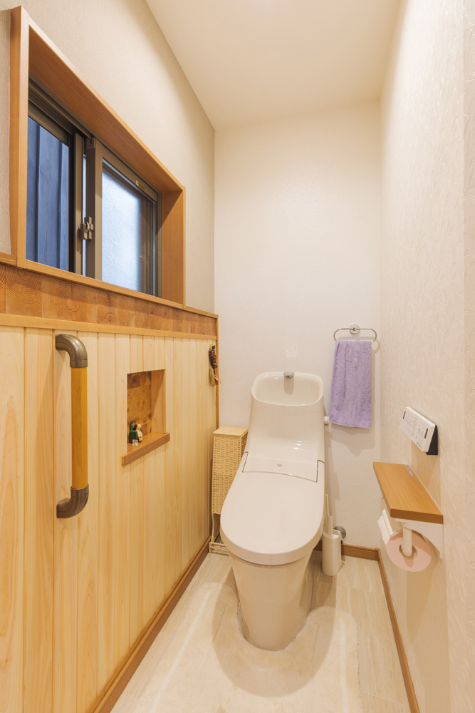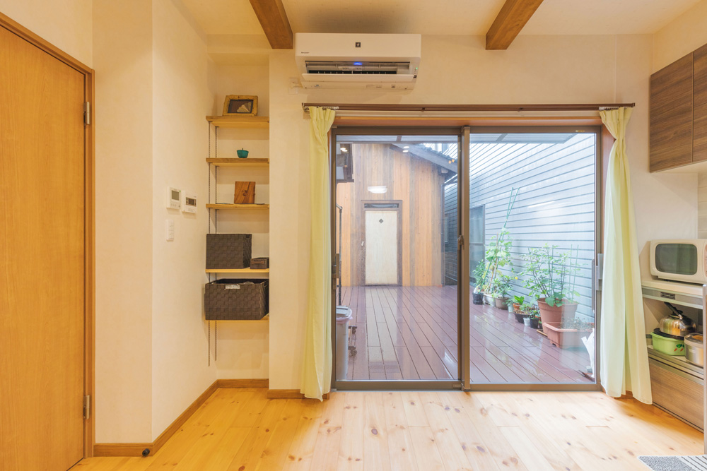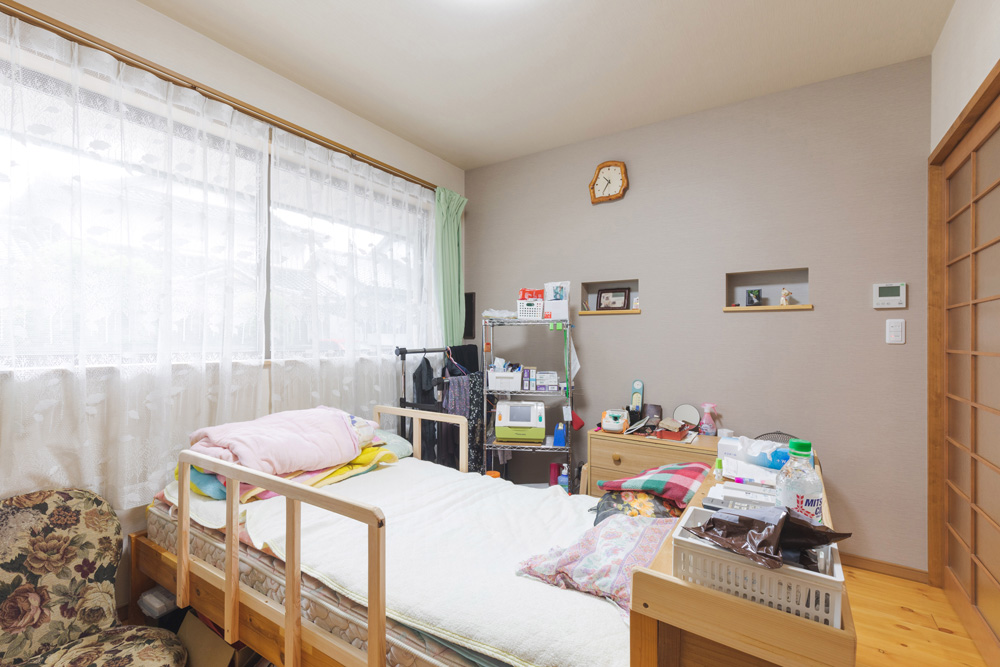 住み慣れた田舎から、新たにリフォームをした場所に来られた際に、ゆっくり休んでいただける寝室になるよう、無垢床・和風の建具・ベット配置を考え、安らぎの空間としました。道路面の部屋になるため遮音性能の高いサッシを使用。自宅で療養中のお母さんが、ご自身のお部屋からリビング・水回りへ行き来しやすい動線を考えました。