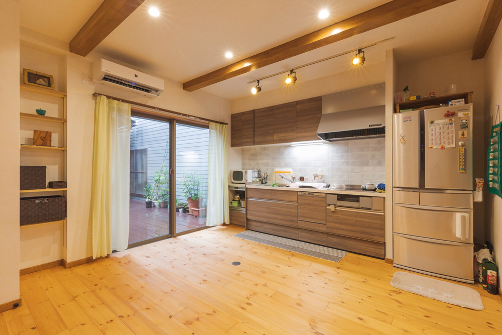 壁面に配置したキッチン・家電食器収納は、1面にすべて収めることで無駄がなくなり、動く距離も最小限に抑えられるよう配慮しました。