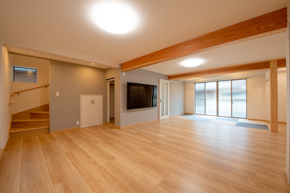 80インチの大画面モニターで、TVや映画・ゲームを楽しみながら、お子さんの遊べるスペースもあり、畳でお昼寝もできる、「家族皆が1つの空間で楽しめる」を実現しました。