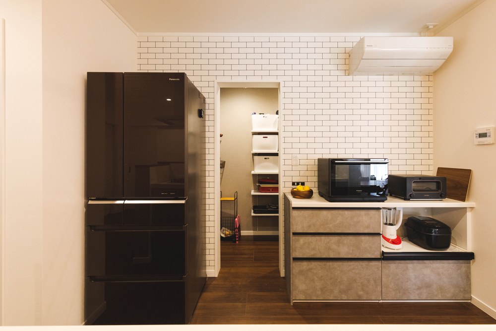 タイル調が素敵なキッチン背面にはカップボードがあり、オシャレな黒色のコンセントを設置しました。その奥のパントリーの内装はエマウォール、可動棚5段を設置しました。