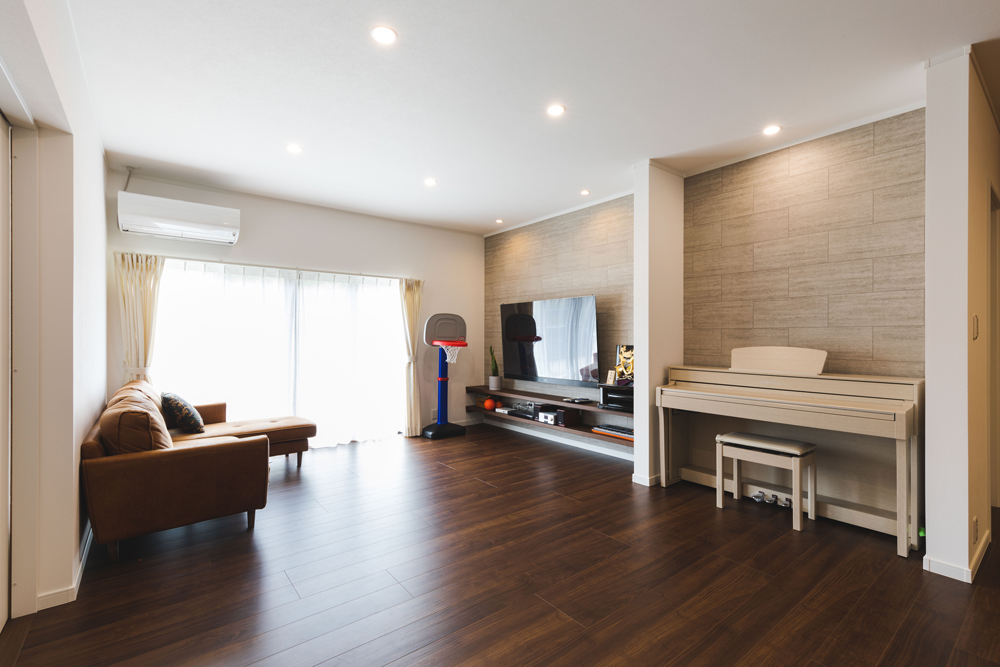大切なピアノをリビングに置くため、サイズ幅を合わせて設置しました。TV側との間に仕切りのあるリビングです。壁掛けTVの下には、カウンターを2段配置しました。