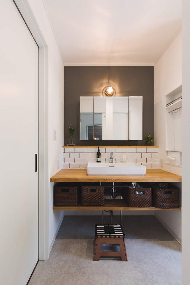アンティーク調のオシャレな照明が洗面スペースを照らします。洗面台は造作で、タオルハンガーもお施主様支給品を取り付けました。洗面の側面にニッチを設置し、タオルハンガーやティッシュケースをスマートに配置。洗面下は通気性の良い収納に。こだわりのオシャレな洗面空間になりました。
