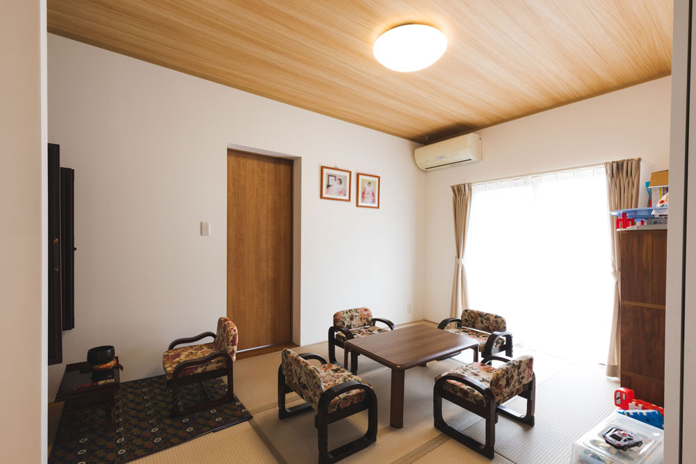 母屋の和室は、ご両親居住家屋のホールとつながる扉のある、家族憩いの場になりました。仏間と板の間のある空間です。