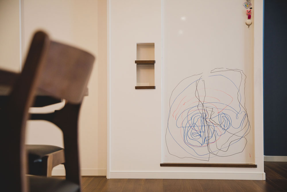 ニッチを少しへこまして、エマウォールというマグネットボードを設置。磁石が付いて、ペンでお絵描きもできる壁パネルで、お子様も楽しく遊んでいます。
