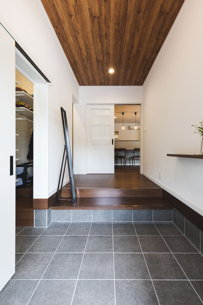 土間収納と飾り棚のある、母屋の玄関です。玄関には式台を設置し、重厚感のある落ち着いた仕上がりになりました。