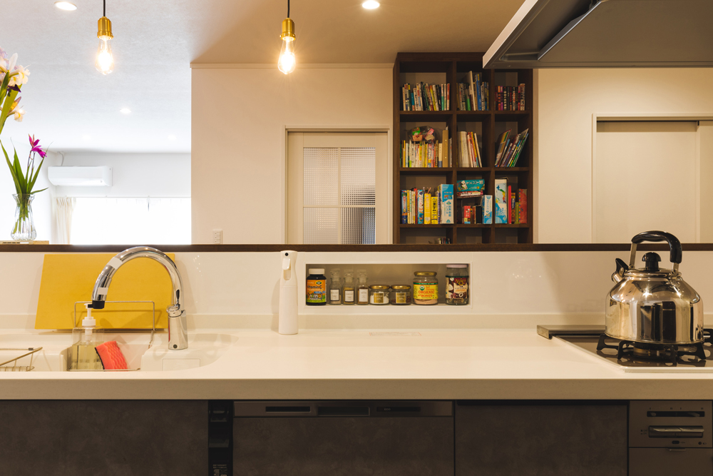 県外から帰ってこられたS様ご夫婦の1番のこだわりは真ん中の広々キッチンカウンターです。ご両親住居家屋と母屋がつながっている二世帯住宅で、時々一緒にみんなで顔を見合わせて、家族団らんで食事ができます。カウンター側のニッチ棚の左右には黒色のコンセントを設置しました。