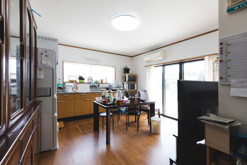 元々土間だった部分を、明るく風通しの良いダイニングキッチンにしました。いままでの愛着のある家具を大事に、ご両親の生活を大切にしたあたたかみのある空間です。